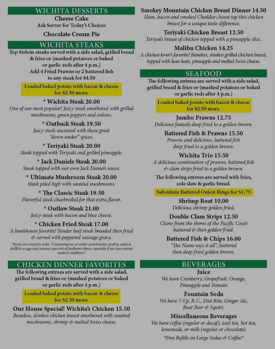 The menu offers a variety of options suitable for different times of the day and dining preferences. It includes a selection of breakfast items, such as pancakes, French toast, and country-style biscuits and gravy, designed for morning or brunch dining. The seafood section features items like jumbo prawns, battered fish and prawns, shrimp dishes, and clam strips, catering to those seeking coastal flavors.