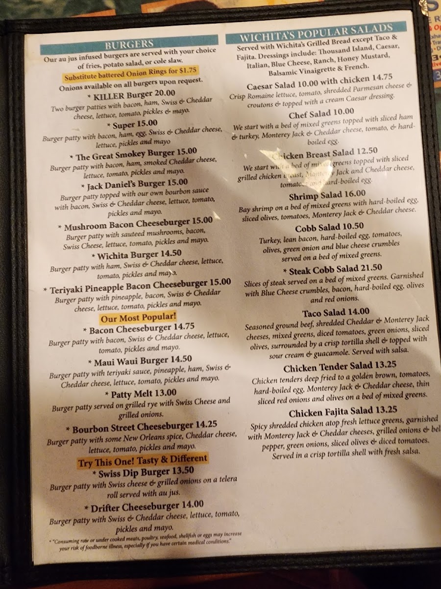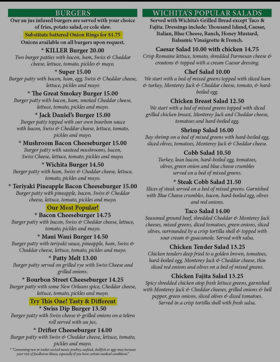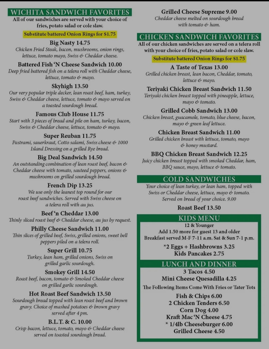 Additionally, the menu includes burgers, sandwiches, and salads, providing choices for casual lunch or dinner meals. Popular items include a range of cheeseburgers, specialty sandwiches, taco salad, and loaded baked potatoes. Light bites and appetizers, such as jalapeno poppers and chicken gizzards, are also available for smaller gatherings or snack options.